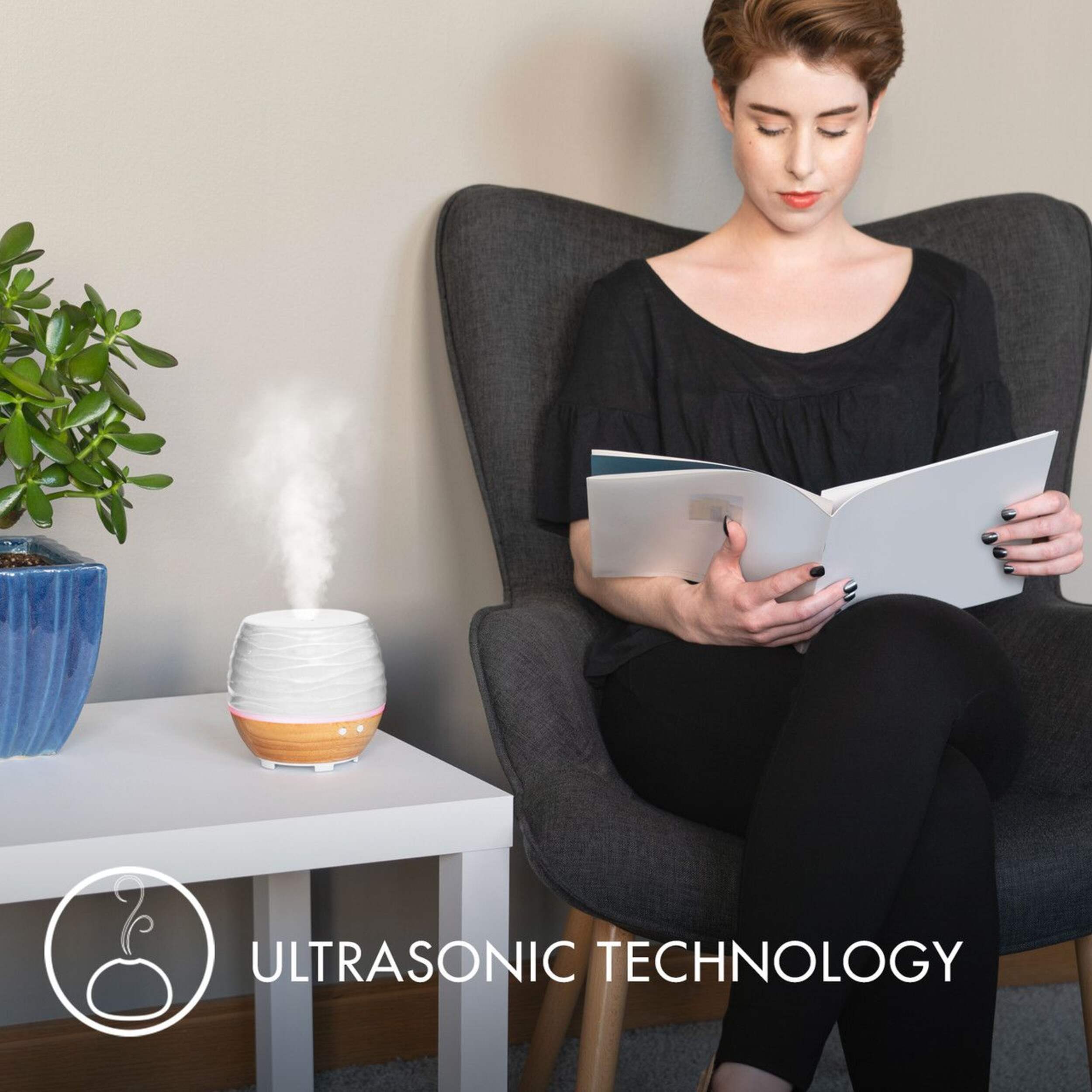 The Ellia Ascend ceramic aromatherapy diffuser set lets you fill your home with natural scents and soothing light. Simply add water and up to seven drops of essential oil to the beautiful wave pattern ceramic diffuser and let the natural aromas spread. The wood and ceramic materials complement nearly any decor whilst the mist up to six hours continuously or twelve hours intermittently help set a relaxing ambiance aided by the color-changing light. Perfect for unwinding at home or the office without worry.