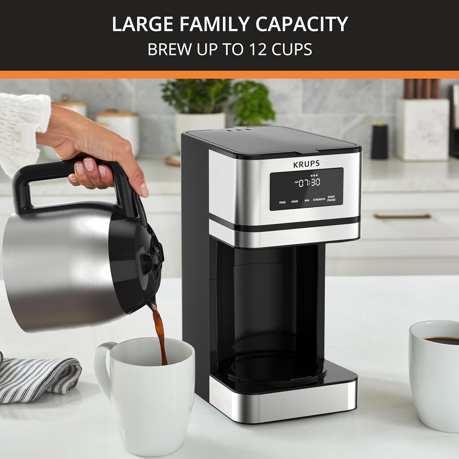Discover the Simply Brew 14-cup Drip Coffee Maker by KRUPS—and enjoy freshly brewed coffee ready when you wake up! Offering up to 14 cups, this automatic coffee machine can be programmed up to 24 hours in advance and proposes 3 coffee strengths for customized brewing. The dishwasher-safe carafe makes clean-up effortless, while a smart design ensures filling is mess-free. What's more, your coffee stays warm for up to 4 hours, thanks to the insulated stainless steel carafe.