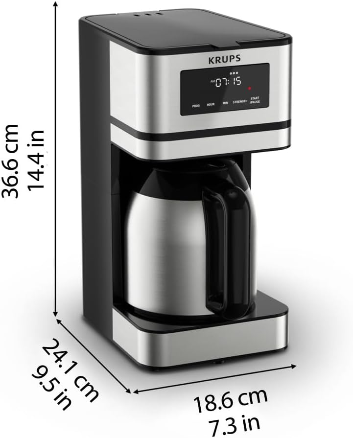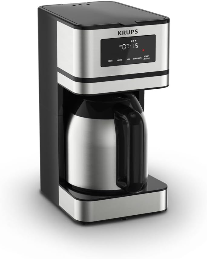 Krups Simply Brew Stainless Steel and Thermal Carafe Drip Coffee Maker 14 Cup Programmable, Customizable, Digital Display, Insulated Coffee Filter, Dishwasher Safe, Drip Free Silver and Black