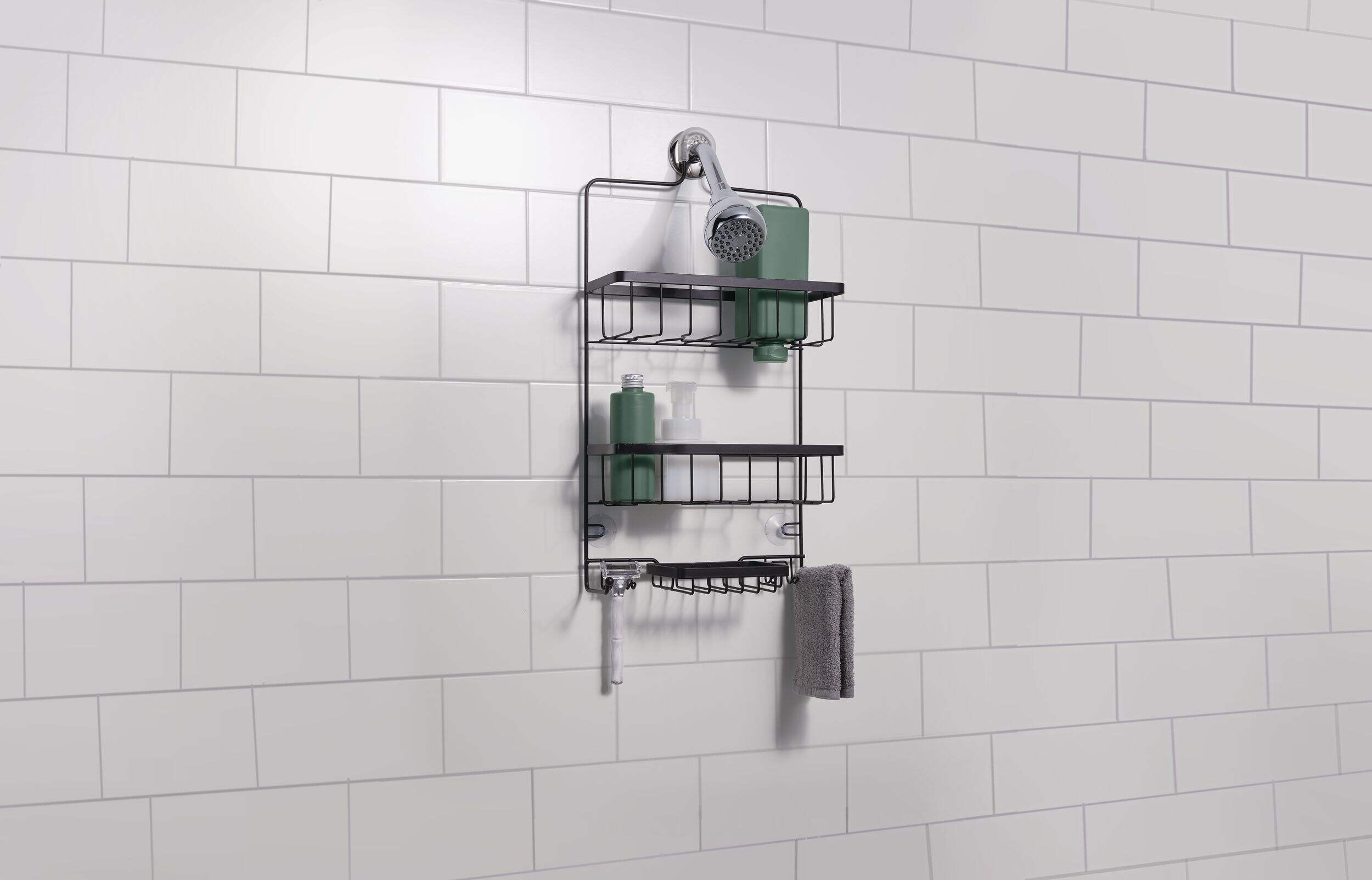 This type A Wire Bath Caddy features two large baskets with bottle holes, a bar soap holder, and two hanging hooks to accommodate all your hygiene necessities. The adjustable caddy fits easily and securely over most showerheads, and it comes with two suction cups to help secure it to the wall. This bath caddy is made from durable metal that is rust-resistant so it's good for long-term use, and it has an attractive black finish.